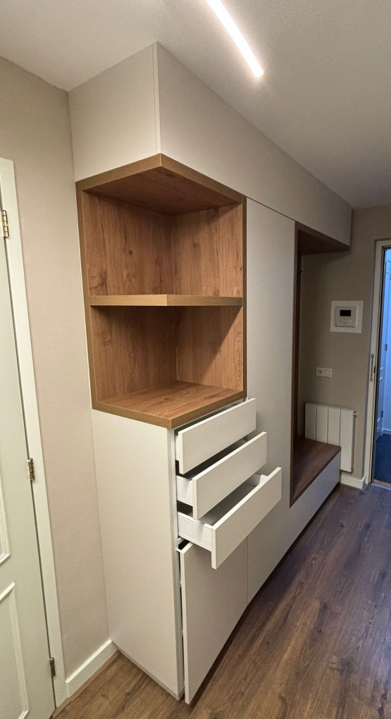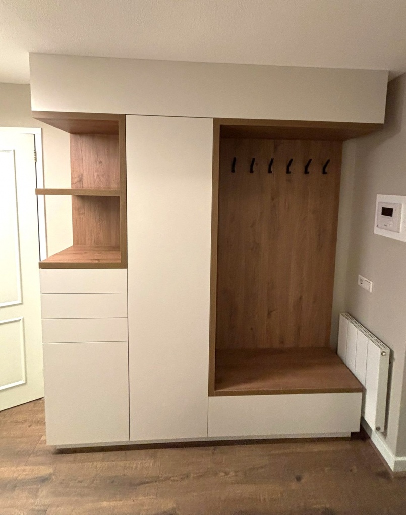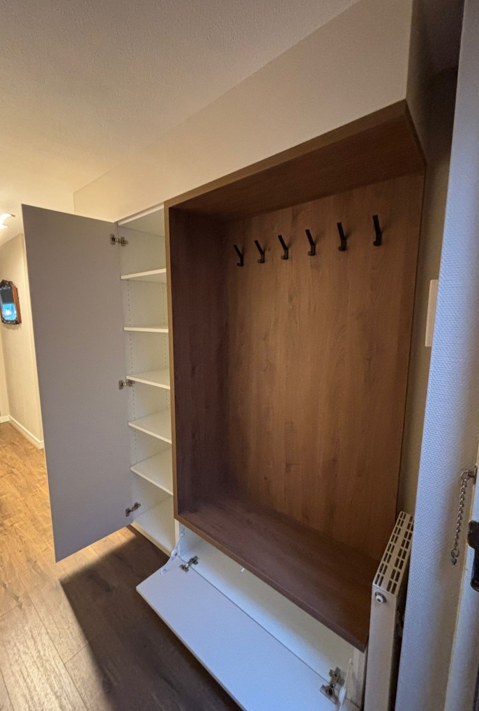 In Apeldoorn realiseerde IMETIS een garderobekast op maat die volledig opgaat in de hal. De kast is ontworpen als een geïntegreerd meubelstuk waarin opbergen, comfort en uitstraling samenkomen. Door de combinatie van melamine in de kleur seashell en houtlook melamine in de nissen ontstaat een rustig geheel met warme accenten. De garderobekast bestaat uit twee hoge kasten en een open gedeelte met kapstokhaken en een klepbankje. Elk onderdeel heeft een duidelijke functie, maar samen vormen ze één krachtig en evenwichtig ontwerp. Zoals bij ieder maatwerkproject van IMETIS is de kast exact afgestemd op de beschikbare ruimte en het dagelijks gebruik.