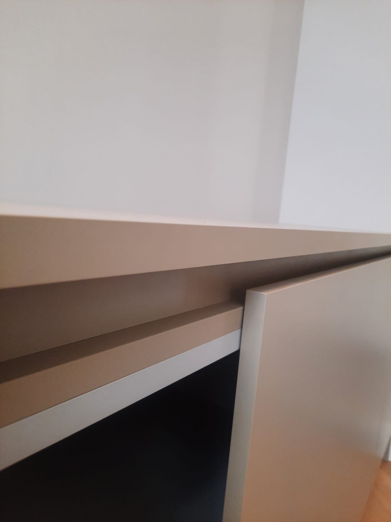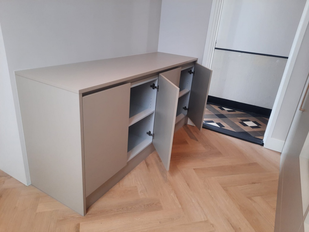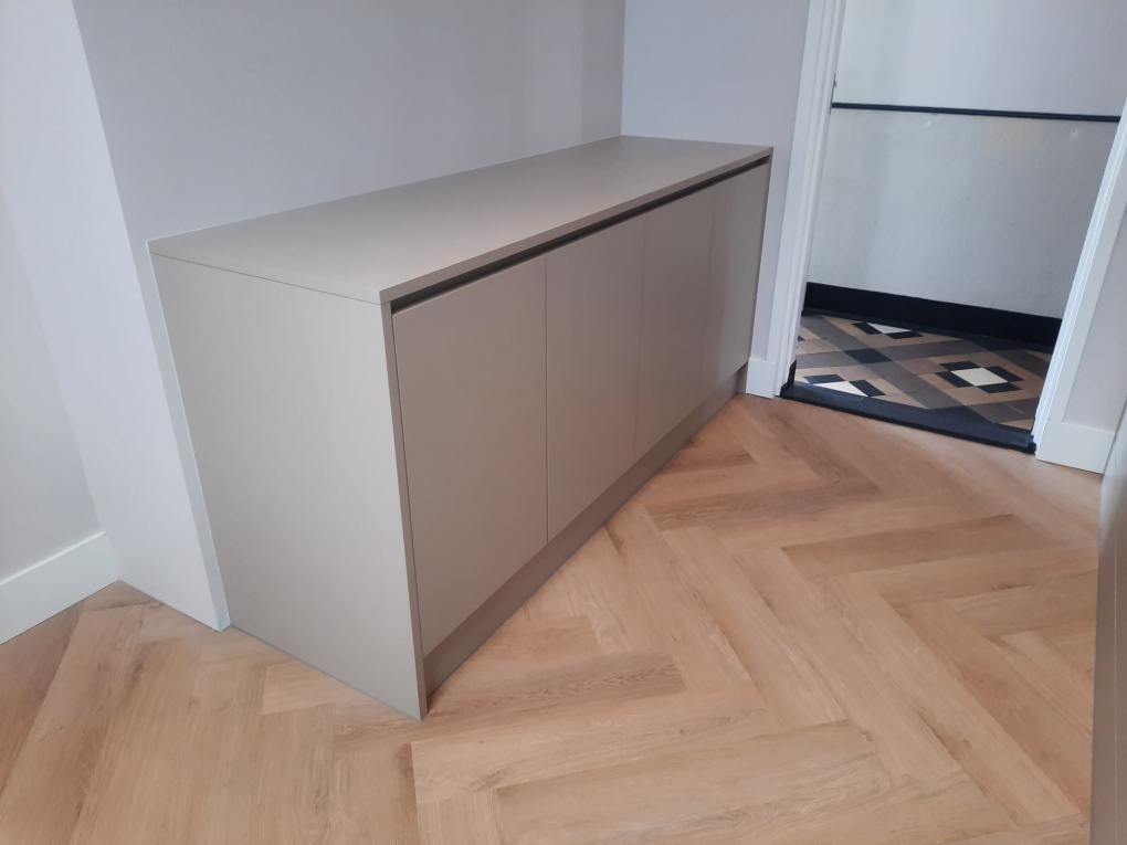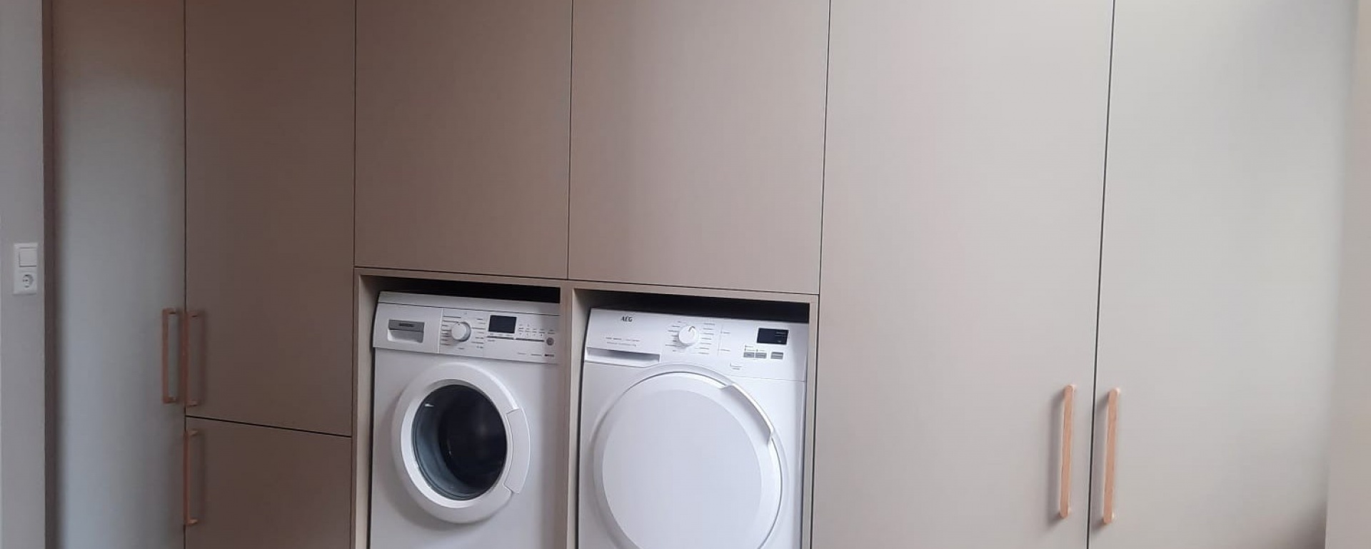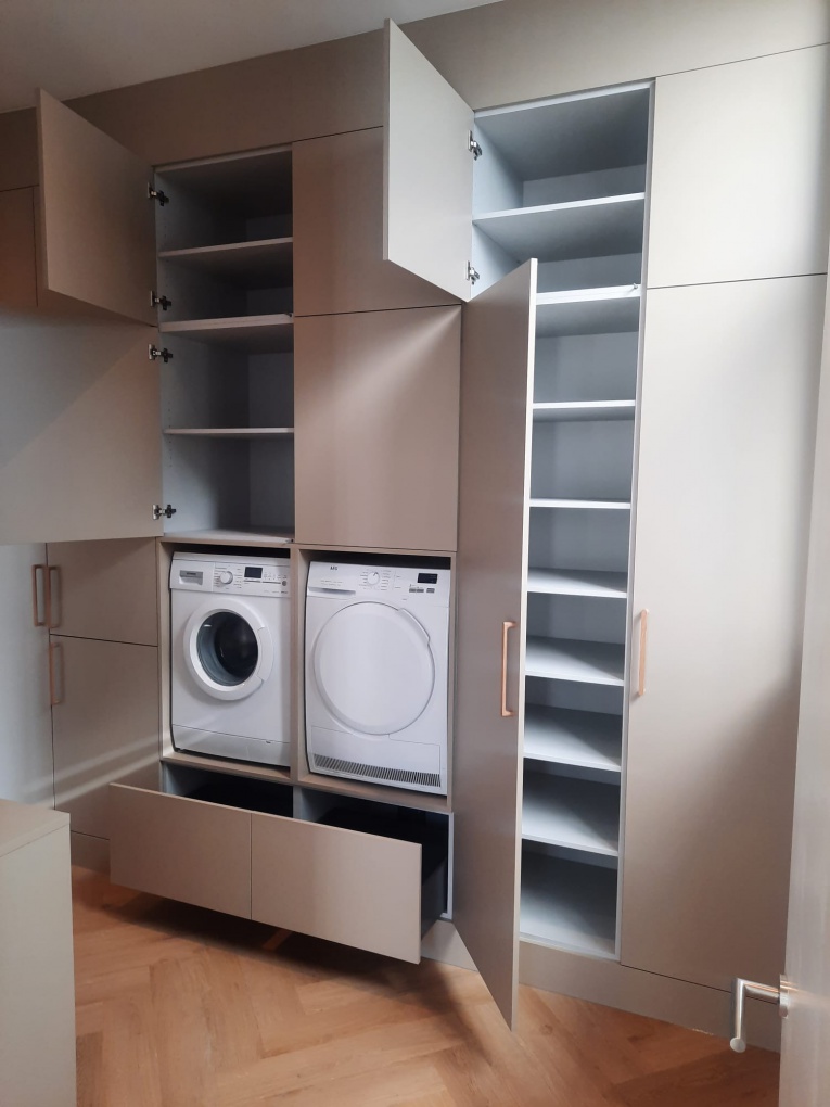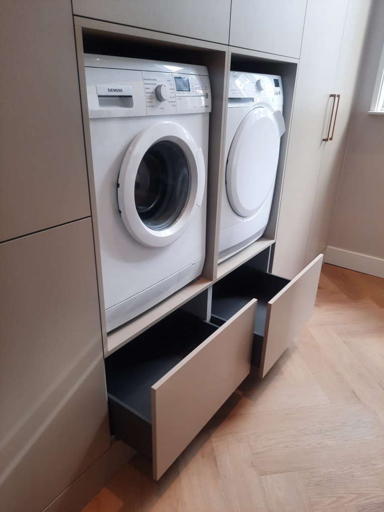In een bijkeuken zijn twee kasten geplaatst. Een grote kastenwand met ingebouwde wasmachine, droger, koelkast en vriezer. Daarnaast een kleinere opbergkast. De buitenste twee deuren en laden zijn met tip-on systeem en de andere deuren met een verdiepte greeplijst. De fronten zijn gemaakt van Melamine in de kleur grey beige (L6160) van Unilin.