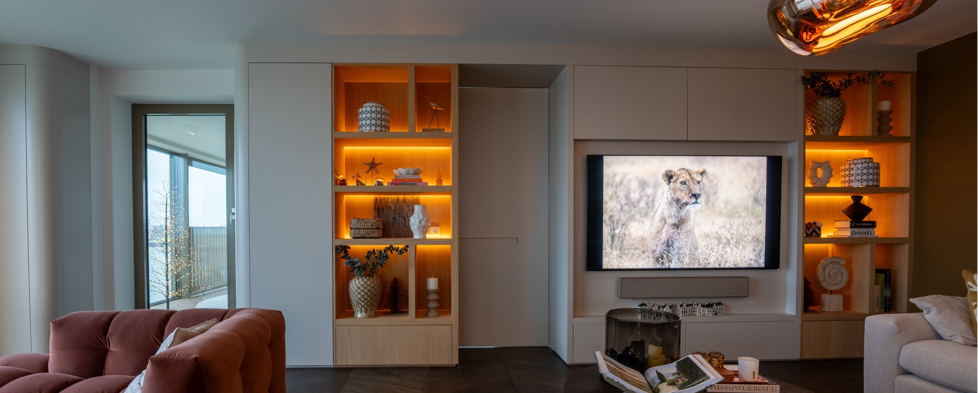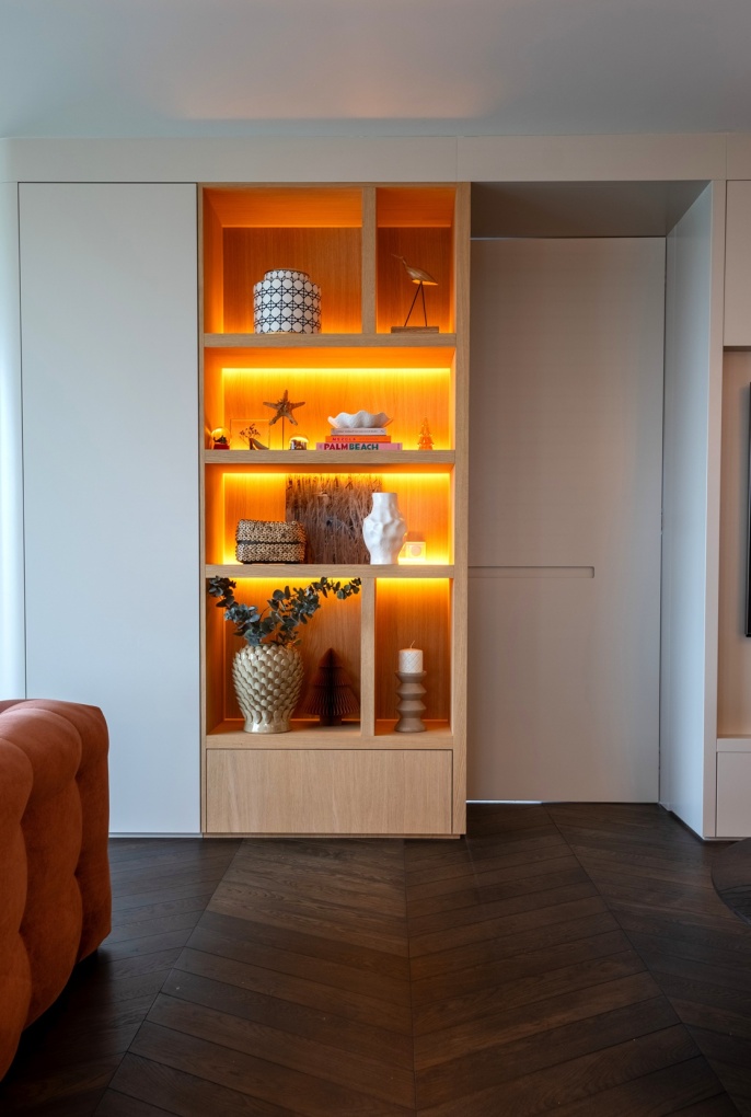 In een appartement met uitzicht op zee realiseerde IMETIS een maatwerk kastenwand die rust, helderheid en functionaliteit samenbrengt. Het ontwerp is afkomstig van Label 31; IMETIS vervaardigde het complete maatwerkinterieur.