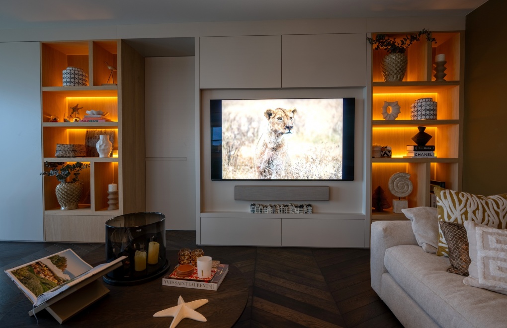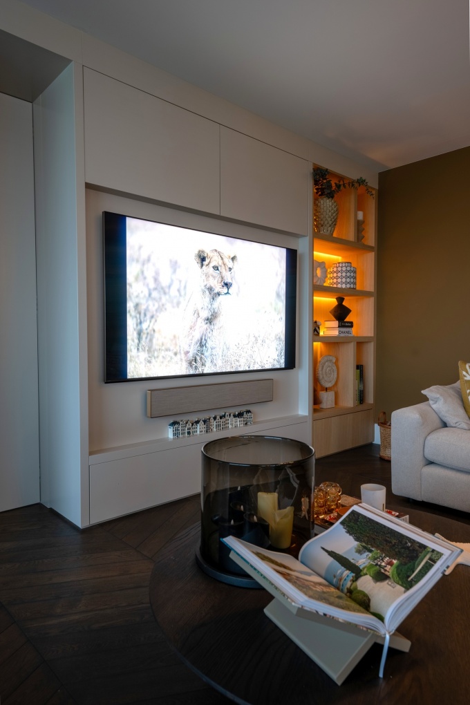 De tv-nis is strak opgenomen in de wand en vormt één geheel met de rest van het ontwerp. De taatsdeur naar de werkkamer is geïntegreerd binnen het lijnenspel en blijft in gesloten stand onderdeel van het front.