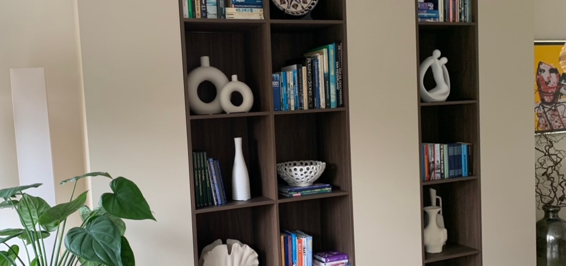 Door deze combinatie ontstaat een moderne vakkenkast waarin kleur en materiaal elkaar versterken, zonder dat het geheel onrustig wordt.