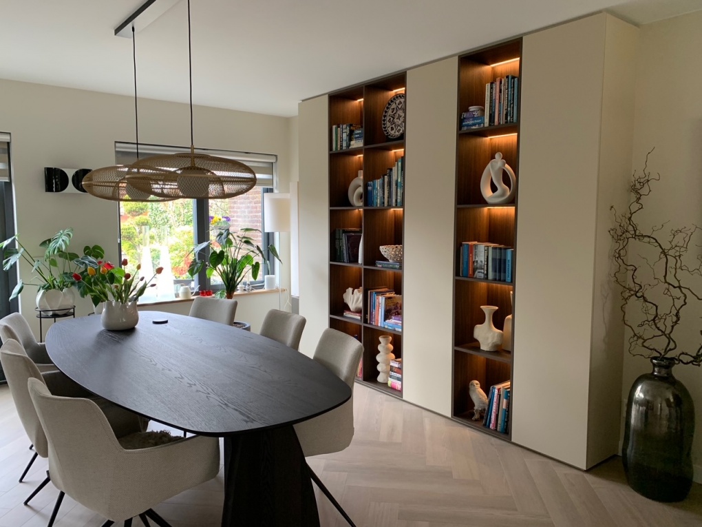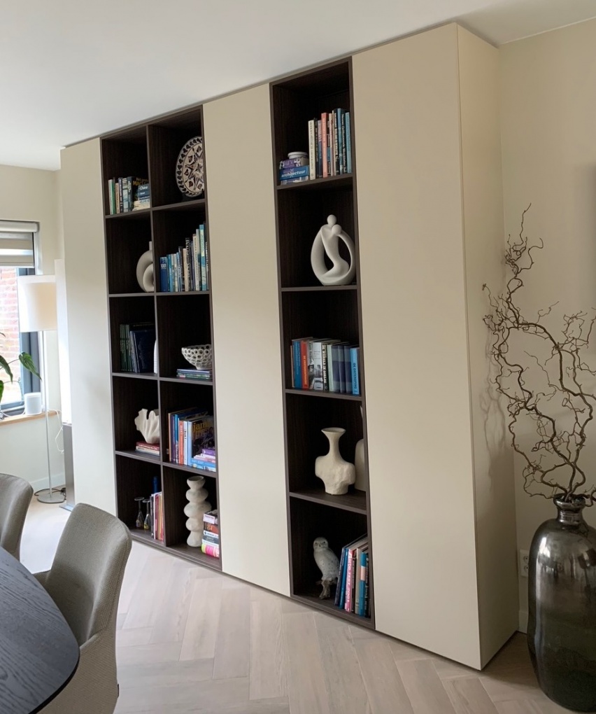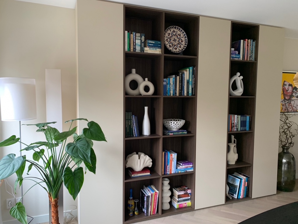In deze kastenwand komt maatwerk tot uiting in de zorgvuldige afstemming tussen indeling, materiaal en techniek. De gesloten kastdelen bieden praktische opbergruimte, terwijl de verstelbare schappen flexibiliteit geven in gebruik.