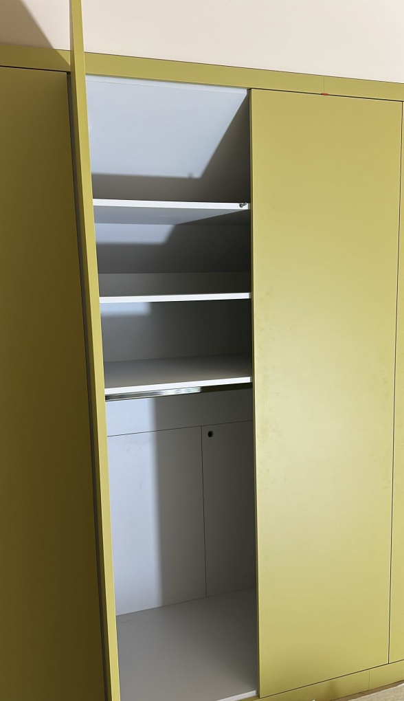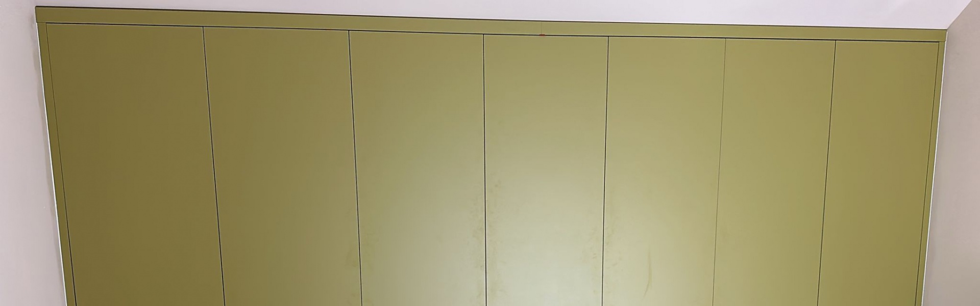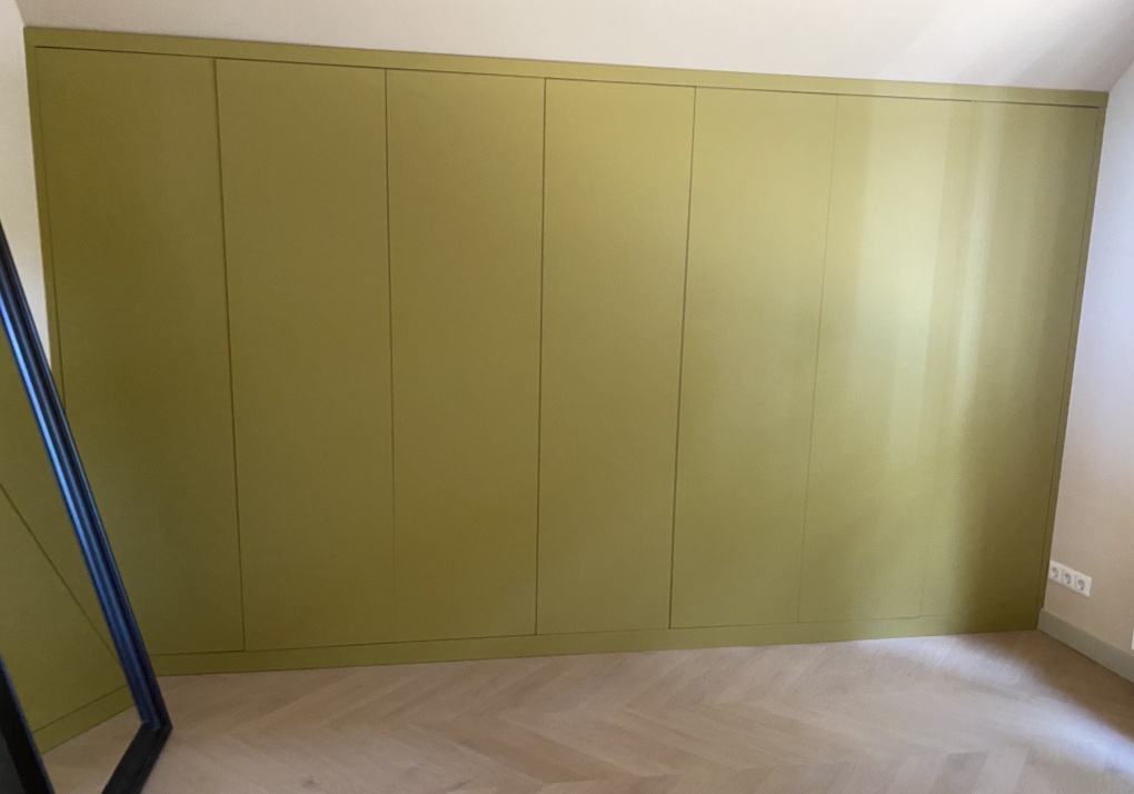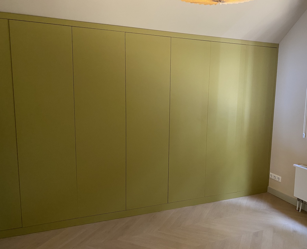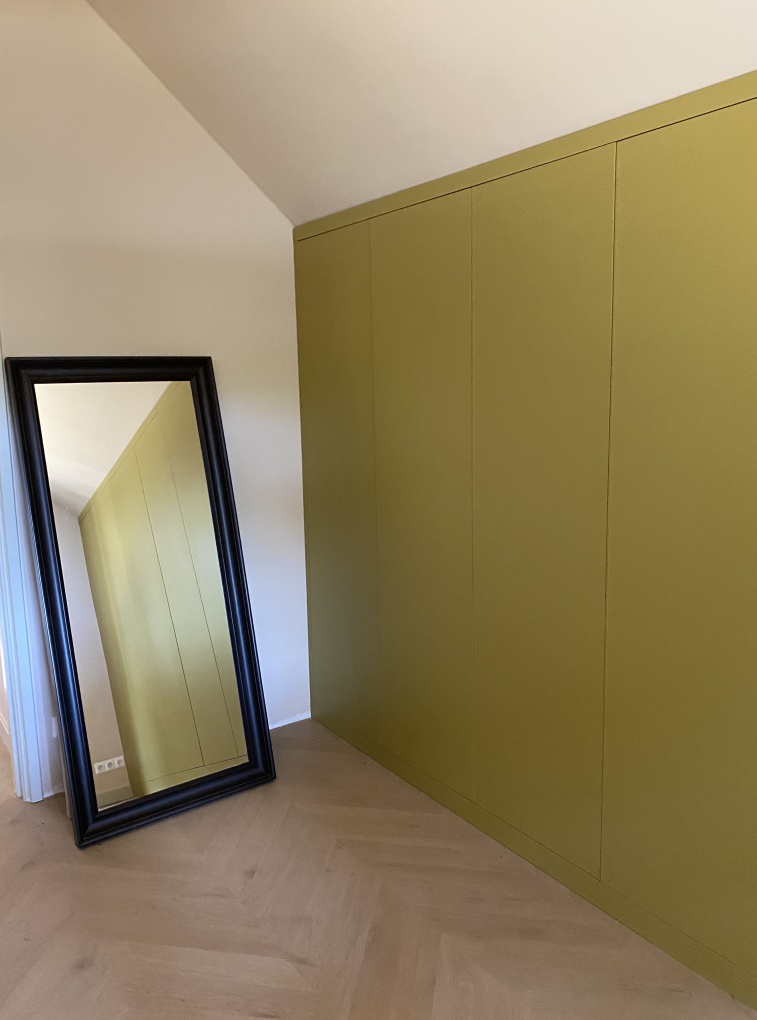 Een grote kledingkast van grond tot plafond en van wand tot wand. In de kledingkast is nog een kast gemaakt onder de schuine wand voor extra bergruimte. De deuren zijn met tip-on systeem. De fronten zijn gemaakt van Melamine in de kleur Smoothie green (OU651BST)