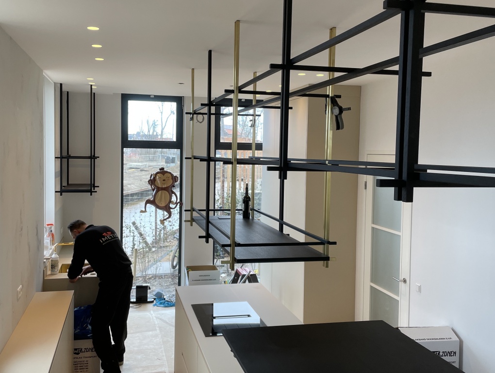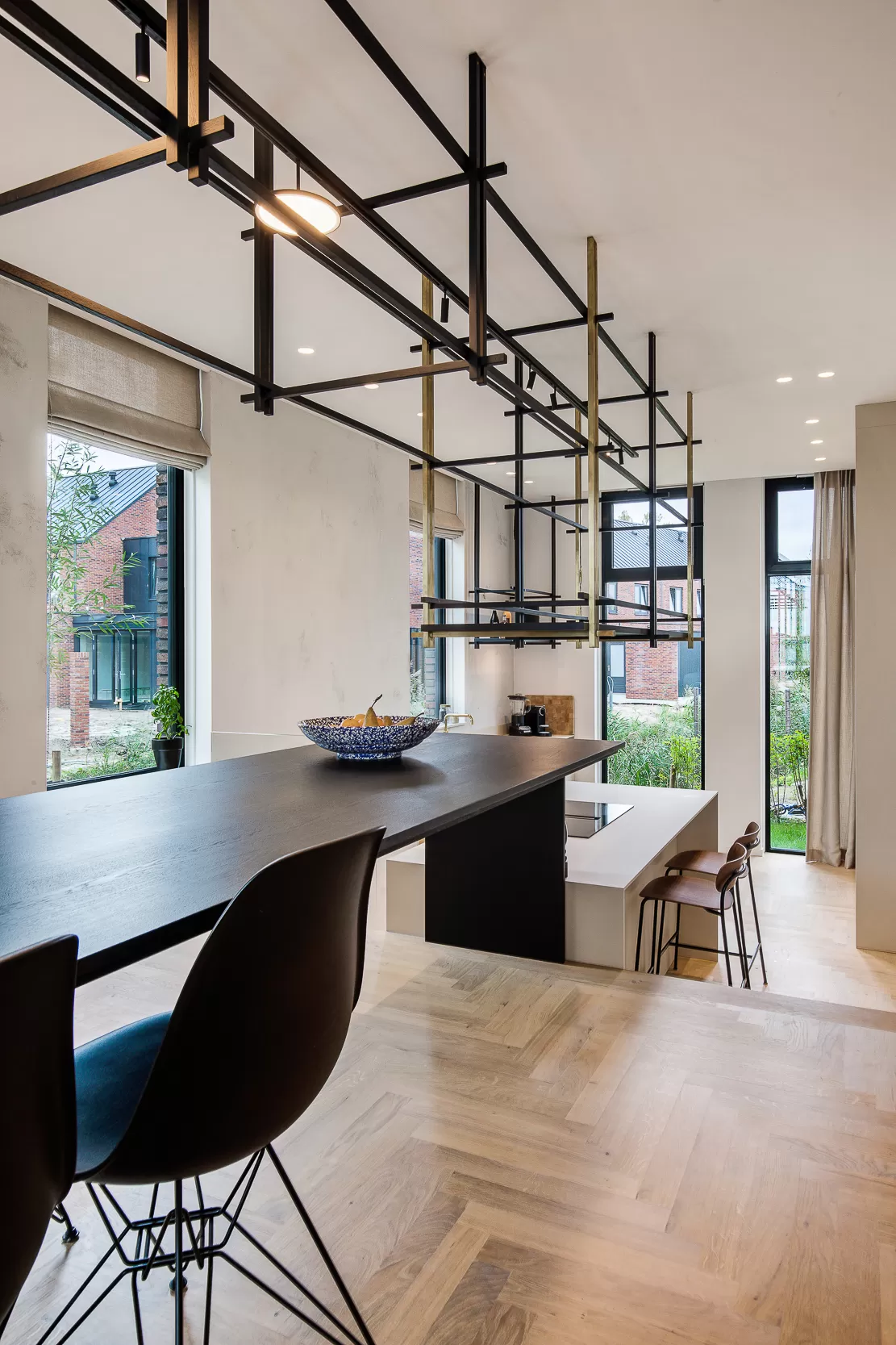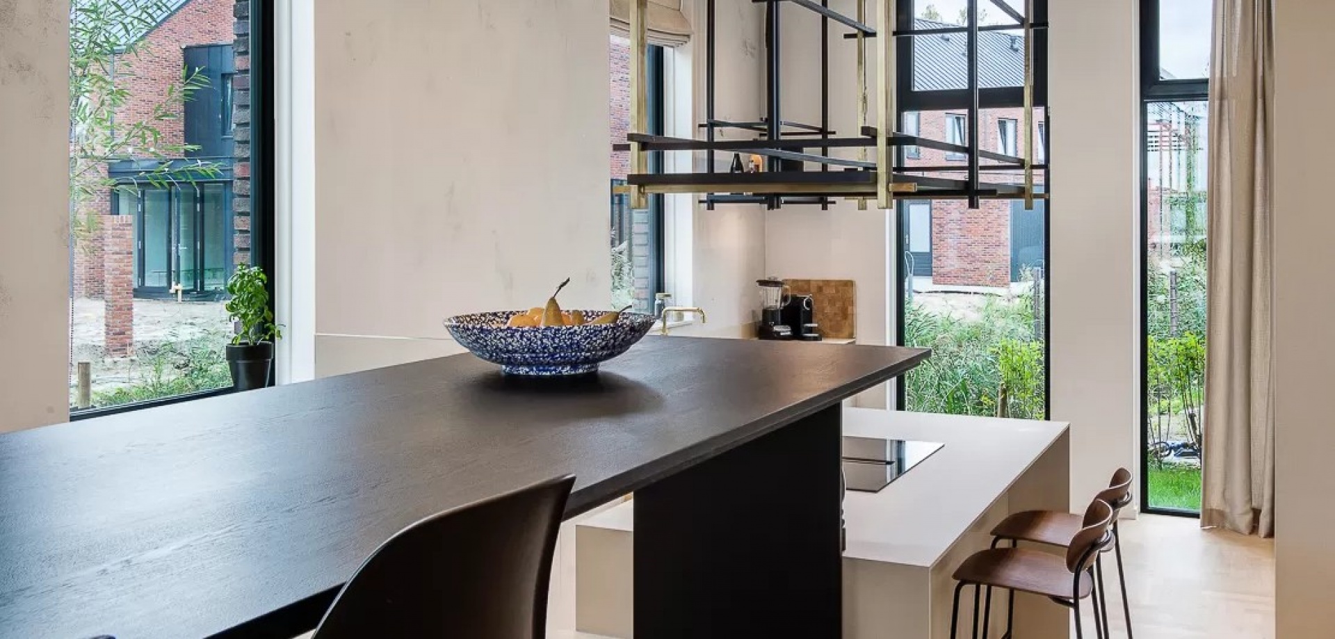 Deze moderne keuken is gemaakt met Fenix materiaal (vingerproof en kras herstellend HPL). De keukenbladen zijn van Fenix Solid. Kenmerkend zijn de strakke lijnen in deze langwerpige keuken. Aan het kookgedeelte zit een donkere eethoektafel welke op een verhoging staat. De verhoging is te bereiken via een messing trap, welke ook door Imetis is gemaakt. Boven het kook- en eetgedeelte hangt een wijnrek van massief eiken gecombineerd met messing.